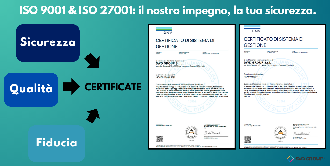 Il raggiungimento degli standard ISO 9001 e ISO 27001 non rappresenta un punto di arrivo, ma una tappa del nostro percorso. SWD Group continuerà a investire in qualità, professionalità e sicurezza per offrire soluzioni sempre più performanti e affidabili.